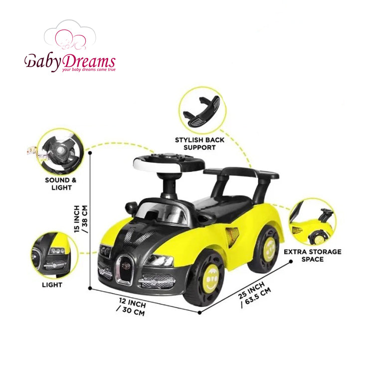 Baby Musical & Light Push Car With Handle 1-5 Years Old Baby Loud Music with Different Tones, with Colorful lights front & backside for baby attraction. Die-casting Plastic with extreme shining. 4 wheel auto-starting Drive Car Logo for Baby Loving, Foot space for smooth drive Suitable for 1 year to 5 years child